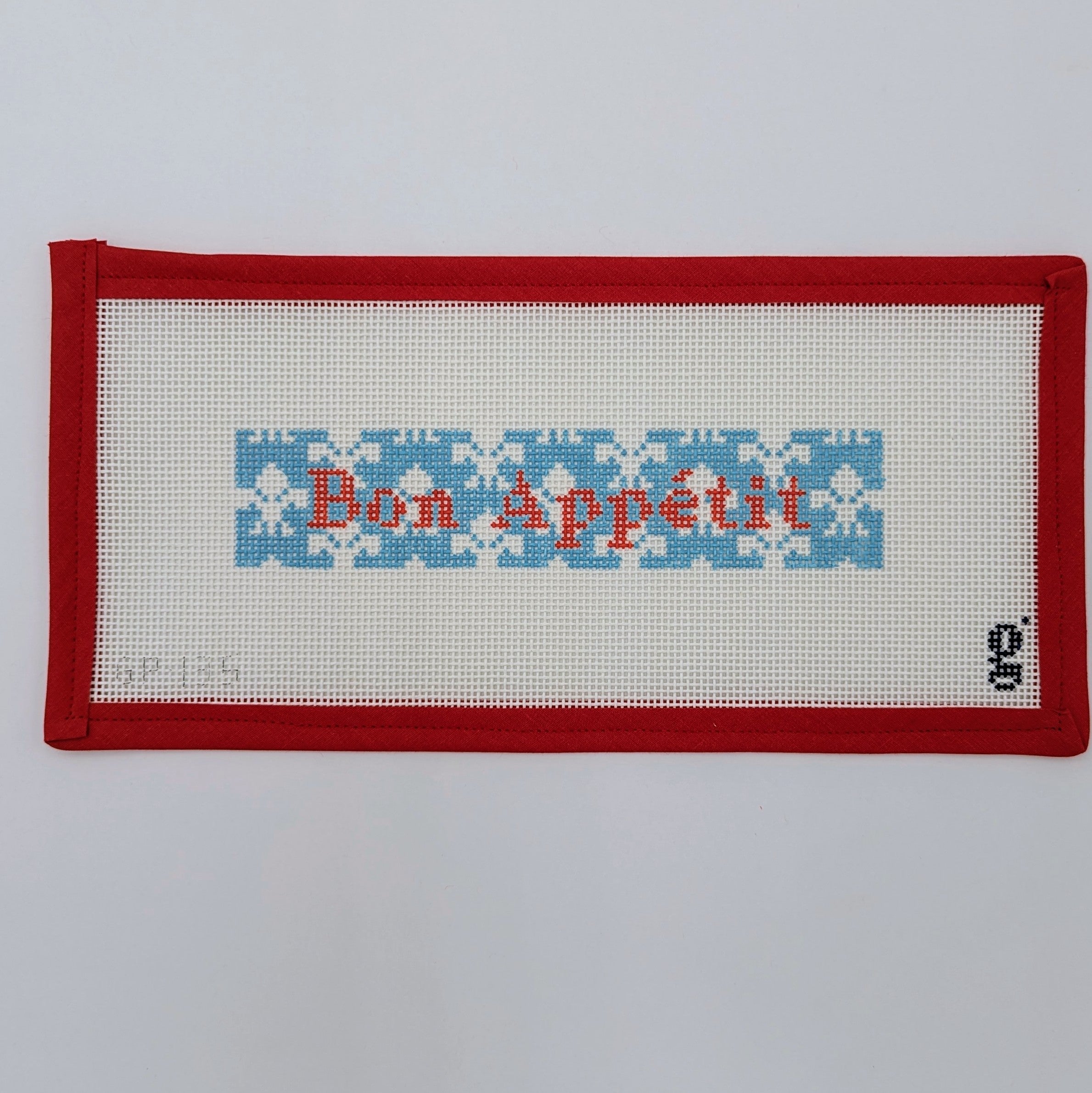 Add a touch of culinary flair to your kitchen decor with the Bon Appetit needlepoint canvas! This delightful design captures the essence of fine dining and gourmet cooking, making it perfect for food lovers and those who enjoy a stylish kitchen aesthetic. Crafted on a 13 mesh canvas and measuring 7.25” x 1.5”, this piece is ideal for stitching a charming decorative item that showcases your love for cooking and entertaining. Stitch this lovely canvas and let it inspire culinary creativity in your home!