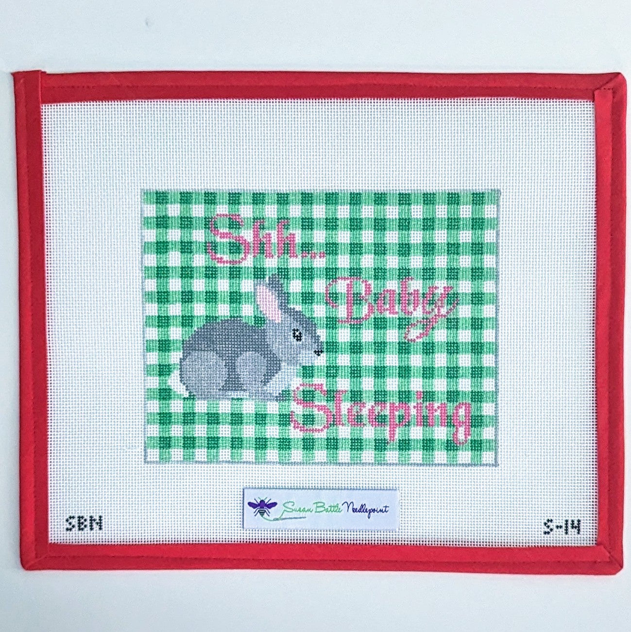 Welcome a touch of charm into your nursery with the Bunny on Gingham Baby Sleeping needlepoint canvas! This adorable design features a sweet bunny peacefully sleeping against a lovely gingham background, perfect for adding a tranquil touch to your child's room. Crafted on an 18 mesh canvas and measuring approximately 7" x 5", this piece is ideal for stitching a delightful decorative item that captures the innocence of childhood. Stitch this charming canvas to create a treasured keepsake for your little one or as a thoughtful gift for new parents!