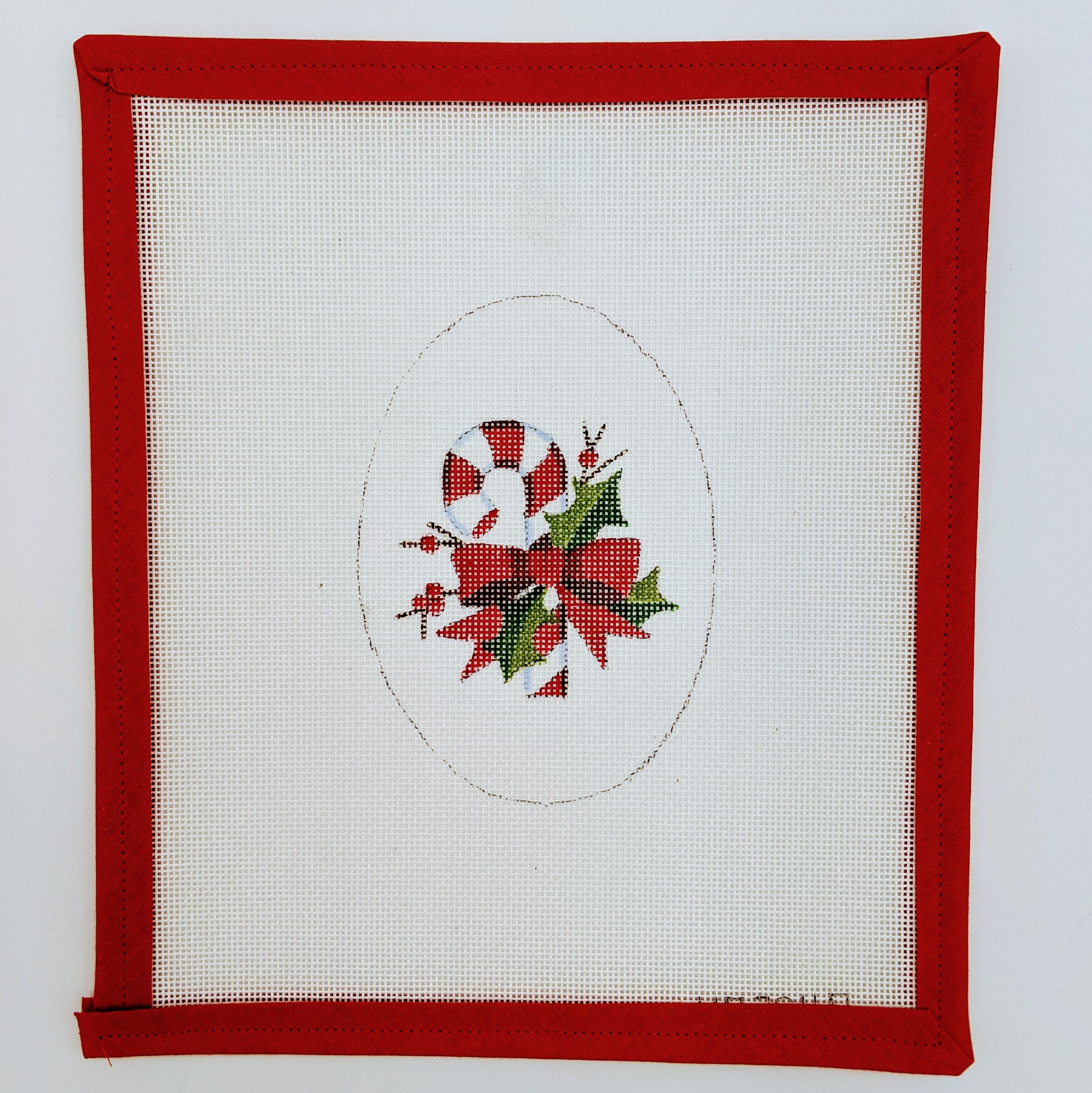 Get into the holiday spirit with the Candy Cane Oval needlepoint canvas! This festive design features a classic candy cane motif, perfect for adding a sweet touch to your seasonal decor. Crafted on an 18 mesh canvas and measuring 5" x 3.5", this piece is ideal for creating a charming ornament or decorative accent that celebrates the joy of Christmas. Stitch this delightful canvas and let it fill your home with holiday cheer!