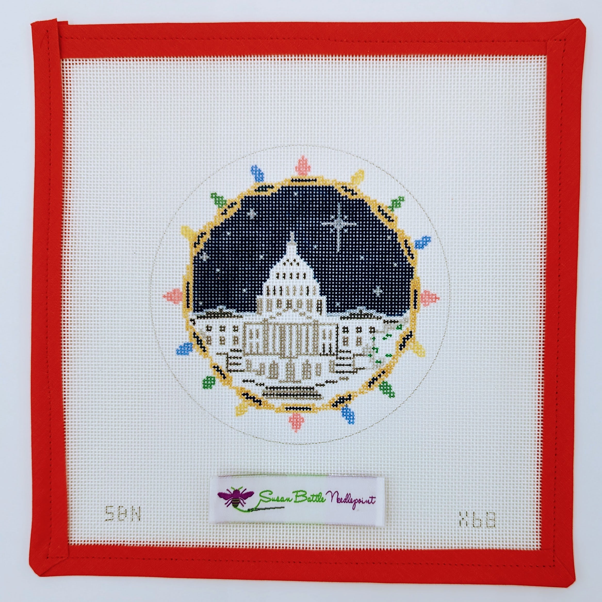 Capture the beauty of the nation's capital with the Capitol w. Night Sky & Lights needlepoint canvas! This stunning design features the iconic Capitol building illuminated against a starry night sky, making it a perfect tribute to the spirit of Washington, D.C. Crafted on an 18 mesh canvas and measuring 5" in diameter, this ornament is ideal for stitching a striking piece that showcases your love for the city. Stitch this elegant canvas to adorn your holiday tree or gift it to someone who appreciates the charm of the Capitol!