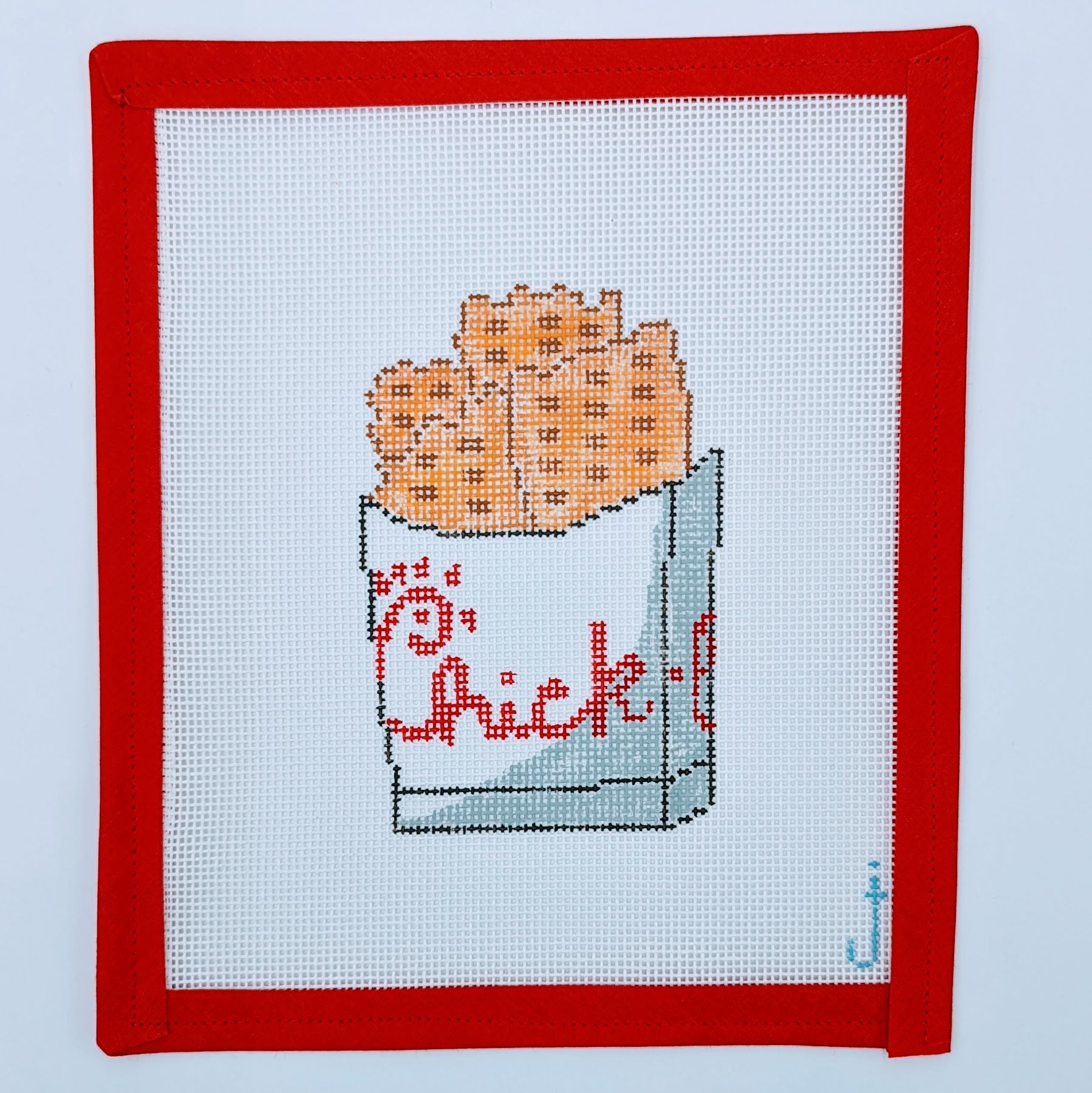 Add a fun and tasty twist to your decor with the Chick-fil-A Waffle Fries needlepoint canvas! This playful design features everyone’s favorite crispy fries, making it the perfect choice for food lovers and fans of this iconic fast-food chain. Crafted on a 13 mesh canvas and measuring 3.5" x 5", this piece is ideal for stitching a unique ornament that showcases your love for these delicious treats. Stitch this delightful canvas and let it bring a smile and some flavor to your home!