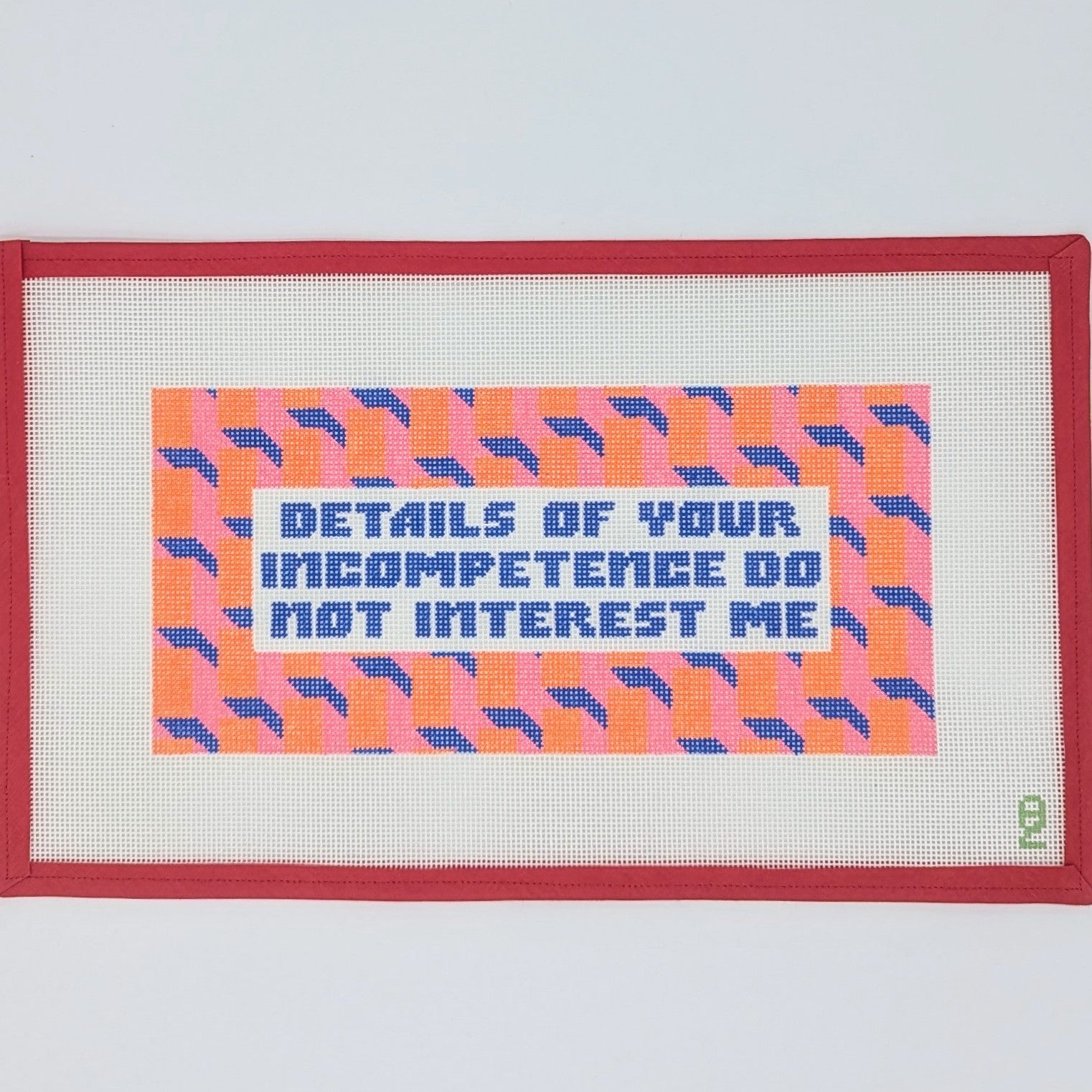Add a touch of humor to your decor with this cheeky Details of Your Incompetence needlepoint canvas! Featuring a playful design, this 13-mesh canvas is perfect for creating a unique pillow or wall art. At approximately 11.5" x 5.5", it’s a fun and manageable project for stitchers of all levels. Whether you’re stitching it for yourself or gifting it to a friend, this canvas is sure to bring a smile!