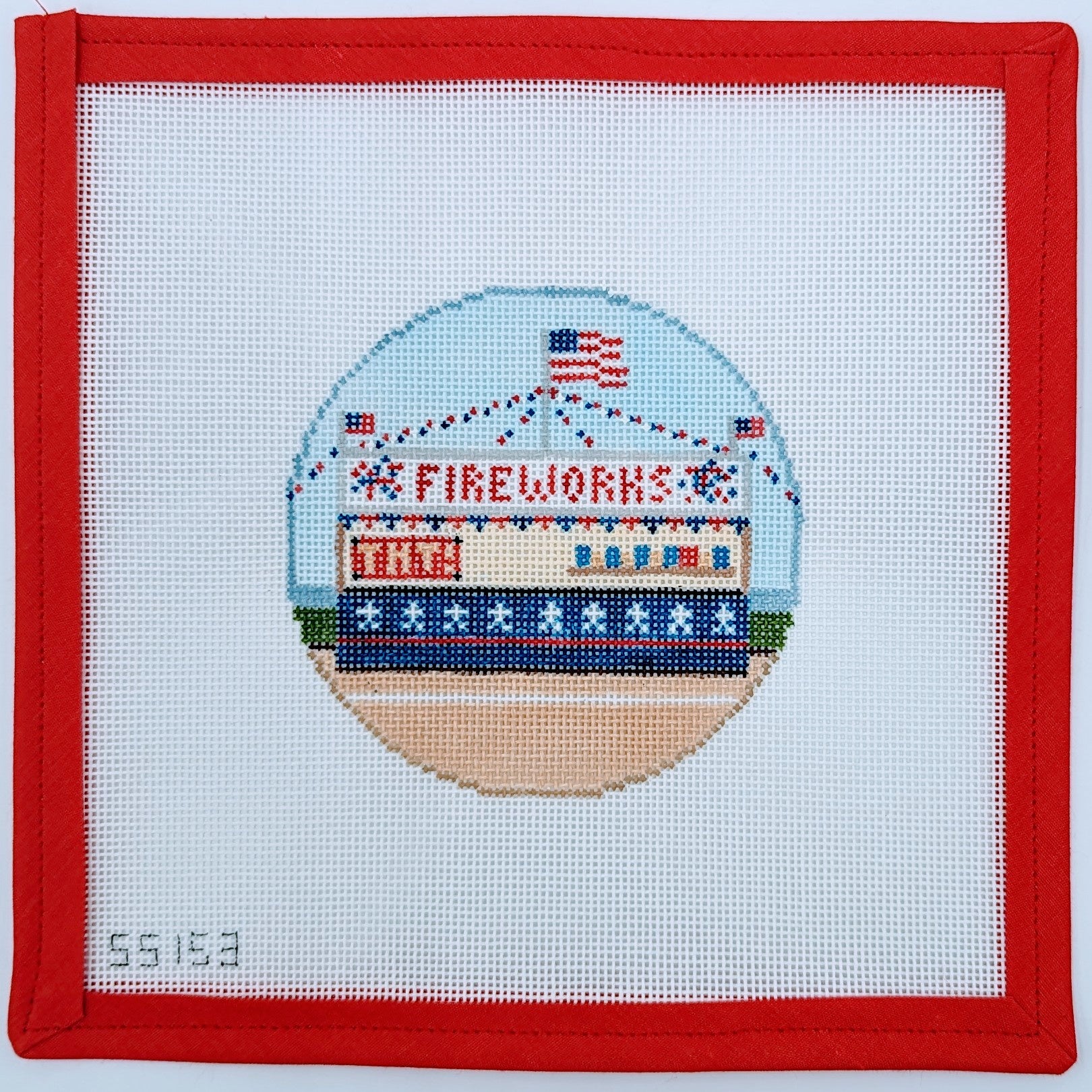 Get ready to sparkle with the Firework Round needlepoint canvas! This festive design features a vibrant display of fireworks, perfect for celebrating special occasions and adding a touch of excitement to your decor. Crafted on an 18 mesh canvas and measuring 4" round, this ornament is ideal for showcasing your stitching skills while bringing holiday cheer to your home. Stitch this lively canvas and let it light up your celebrations!