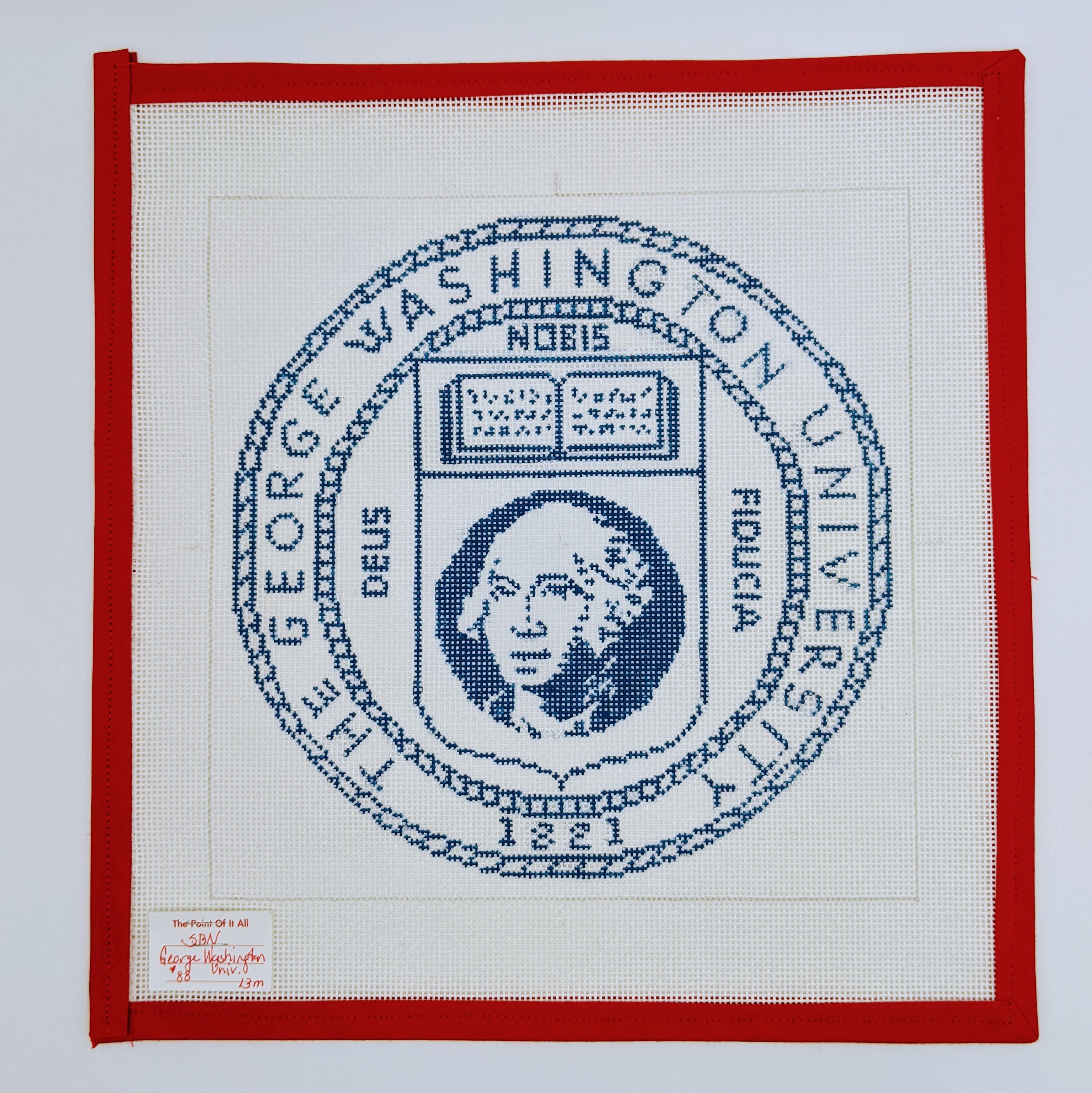 Show off your GW pride with this classic George Washington University Seal needlepoint canvas! Featuring the iconic GW seal in blue and white, this 13-mesh canvas is perfect for creating a pillow, wall art, or decorative accent. At approximately 10" x 10", it’s a fun and manageable project for stitchers of all levels. Whether you’re stitching it for yourself or gifting it to a fellow Colonial, this canvas is a timeless way to celebrate your GW spirit!