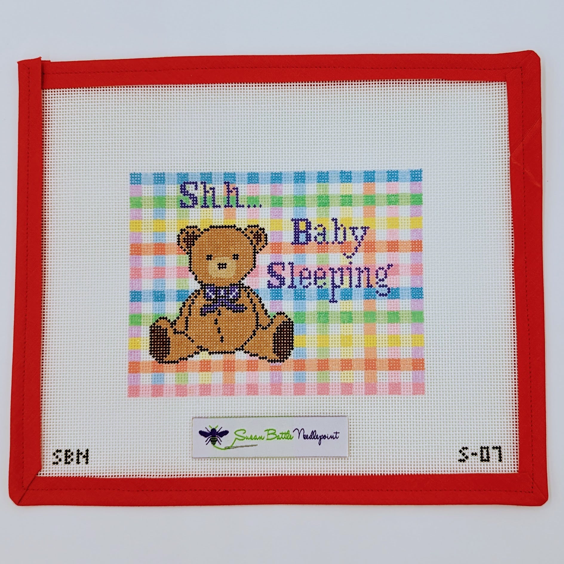 Welcome a sense of tranquility into your nursery with the Gingham Baby Sleeping w. Bear needlepoint canvas! This adorable design features a sweet bear peacefully sleeping against a cozy gingham background, making it perfect for adding a soothing touch to your child's room. Crafted on an 18 mesh canvas and measuring approximately 6.75" x 4.5", this piece is ideal for stitching a lovely decorative item that captures the innocence of childhood. Stitch this charming canvas to create a treasured keepsake or gift for new parents!