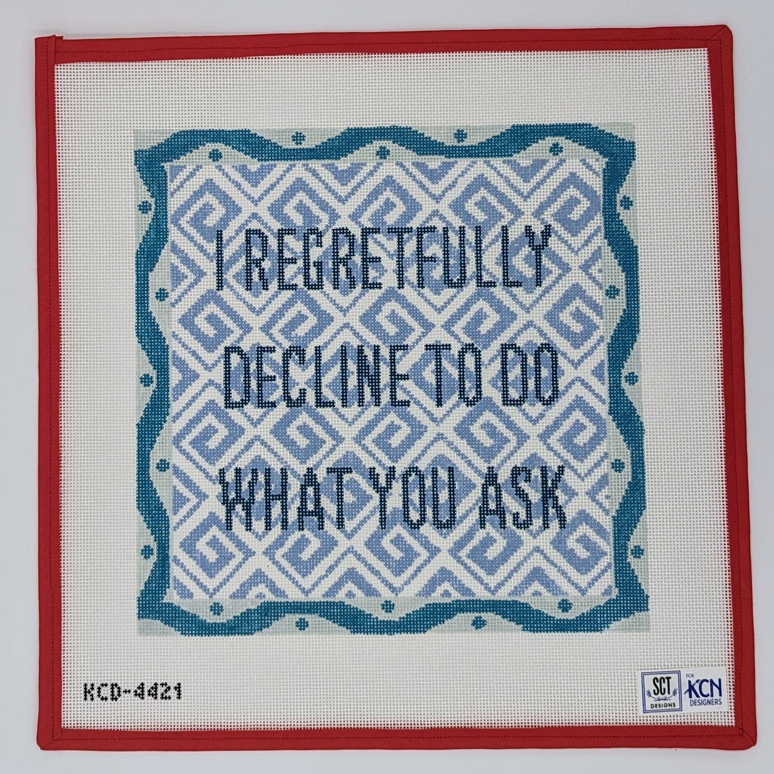 Add a humorous touch to your decor with the I Regretfully Decline needlepoint canvas! This witty design captures a playful sentiment, perfect for those who appreciate a bit of lighthearted sarcasm in their home. Crafted on a 13 mesh canvas and measuring 11.5" square, this piece is ideal for stitching a decorative item that showcases your personality and sense of humor. Stitch this delightful canvas and let it bring smiles and laughter to your space!