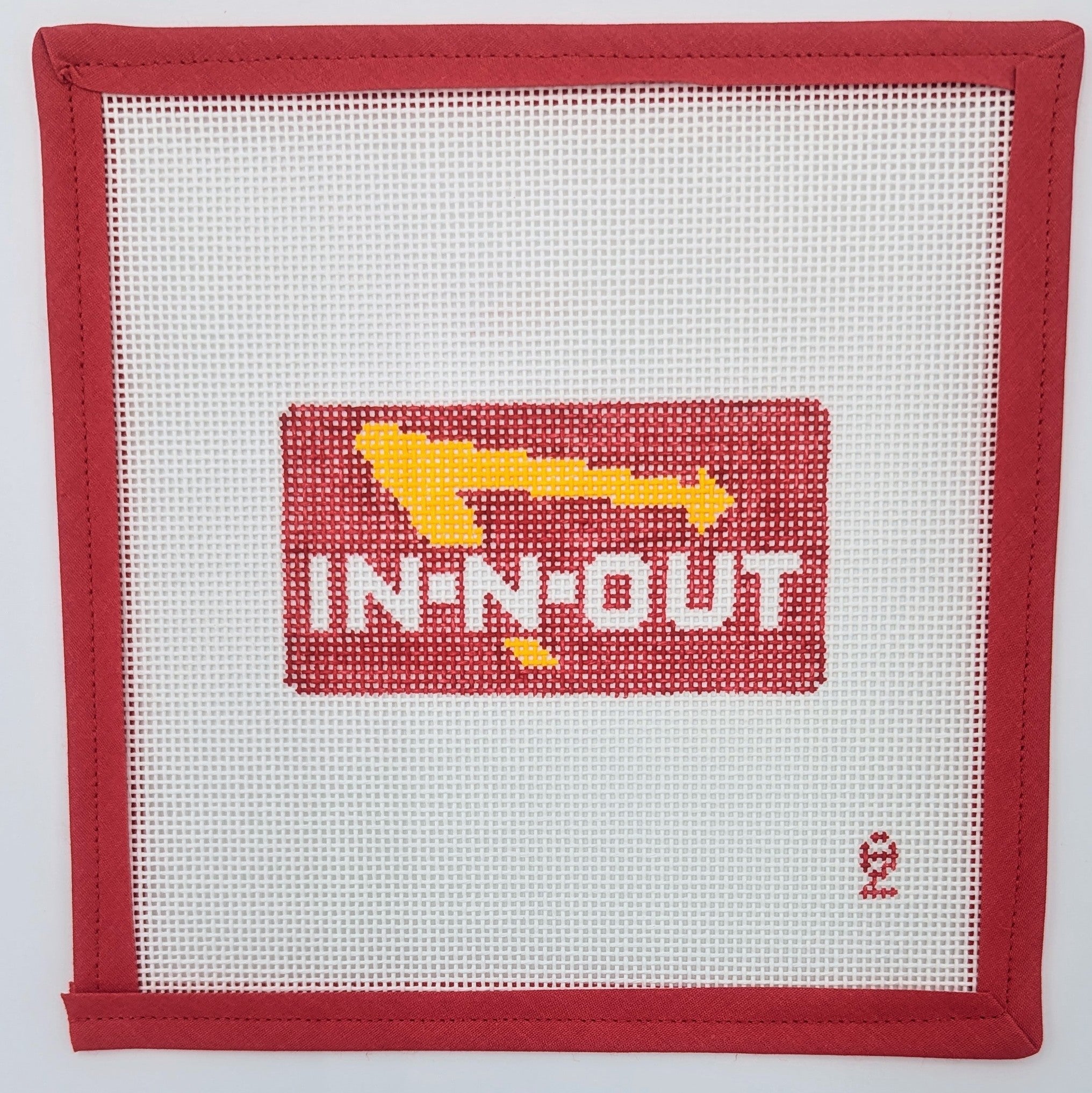 Celebrate your love for burgers with this fun IN-N-OUT needlepoint canvas! Featuring the iconic IN-N-OUT design, this 13-mesh canvas is perfect for creating a unique ornament or decorative piece. At approximately 2.5" x 4.5", it’s a quick and enjoyable project for stitchers of all levels. Whether you’re stitching it for yourself or gifting it to a fellow burger lover, this canvas is sure to bring a smile!