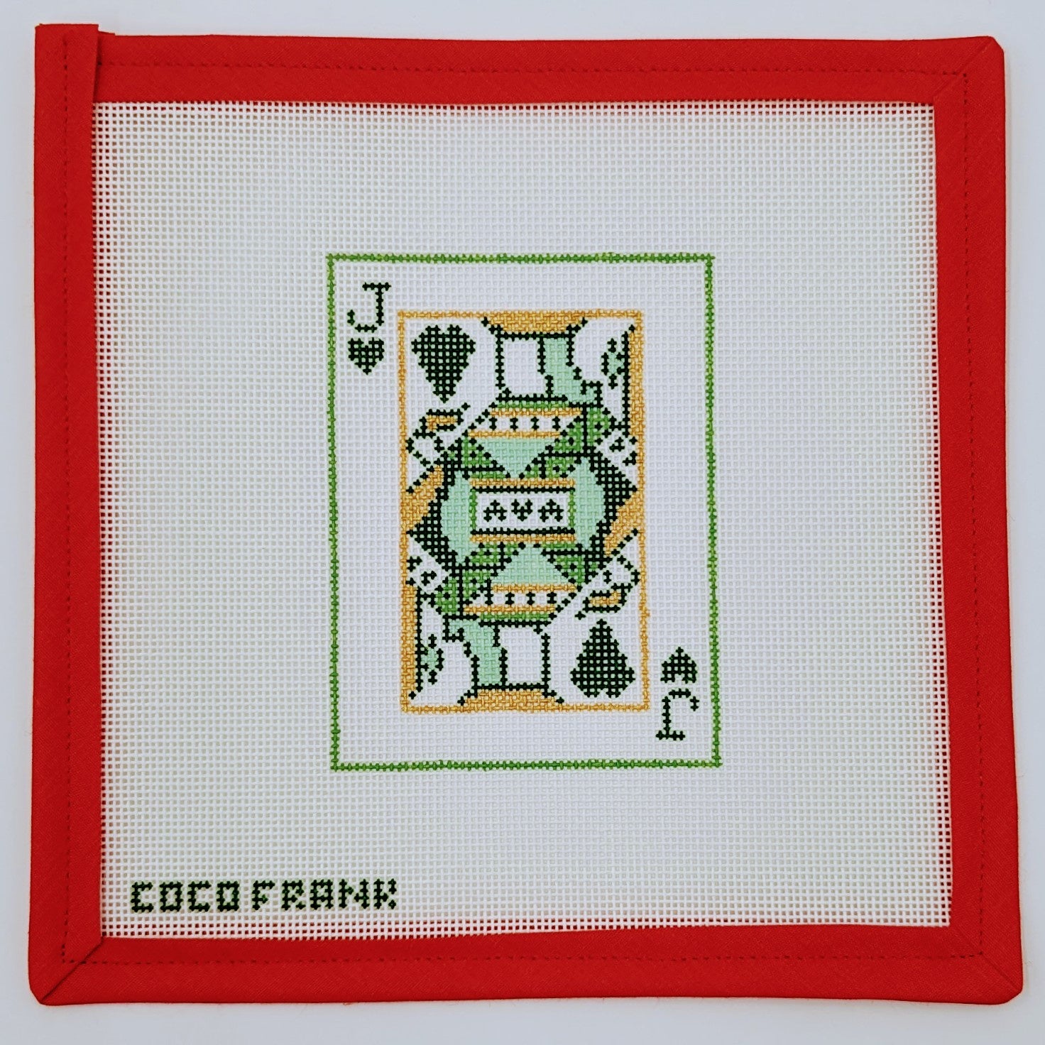 Dive into a world of whimsy and wonder with our delightful Jack of Hearts needlepoint canvas! This charming design features a playful take on the classic playing card, showcasing the cheeky Jack with his trademark smile and heart motif. Perfect for creating a unique ornament or a fun decorative piece, this 18-mesh canvas is sure to delight stitchers of all ages. Grab your needle and threads, and let the stitching adventures begin!