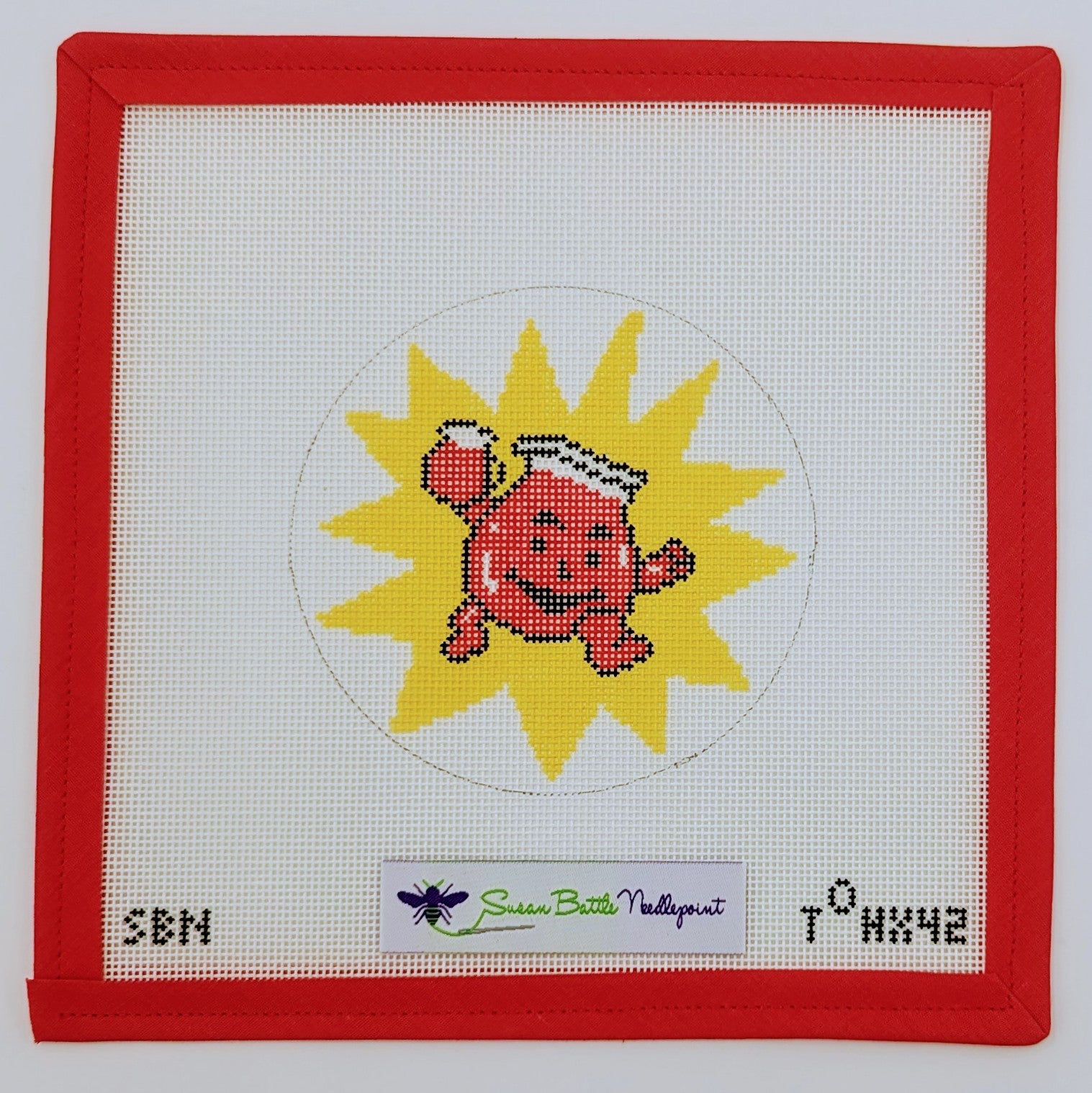 Bring some nostalgia to your decor with the Kool-Aid Man needlepoint canvas! This fun design features the iconic character bursting through the wall, perfect for adding a playful touch to any space. Crafted on an 18 mesh canvas and measuring 4" round, this piece is ideal for stitching a delightful ornament or decorative item that celebrates the joy of childhood and the refreshing taste of Kool-Aid. Stitch this vibrant canvas and let it bring a smile to your home!