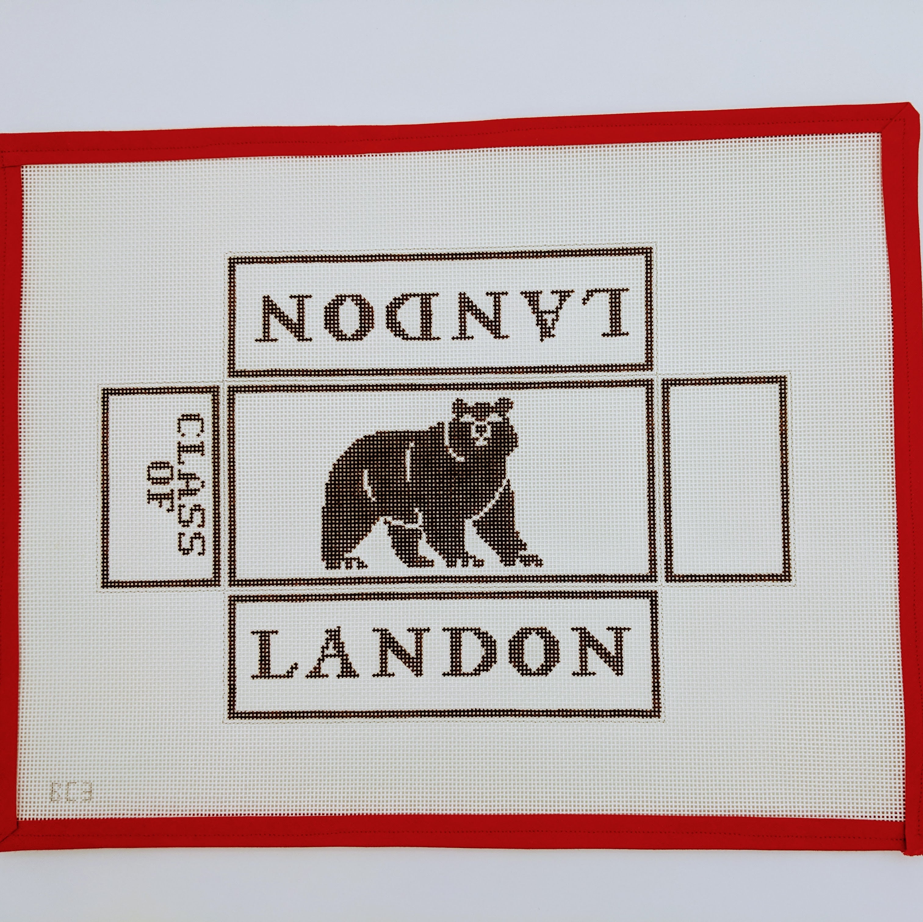 Celebrate your connection to the Landon School with the Landon School Bear Brick Cover needlepoint canvas! This charming design features a delightful bear motif that beautifully represents the spirit of the school. Crafted on a 13 mesh canvas and measuring 17" by 13.5", this project allows you to create a unique and personalized brick cover that adds a special touch to your home or garden. Stitch this lovely piece as a tribute to your Landon School pride!