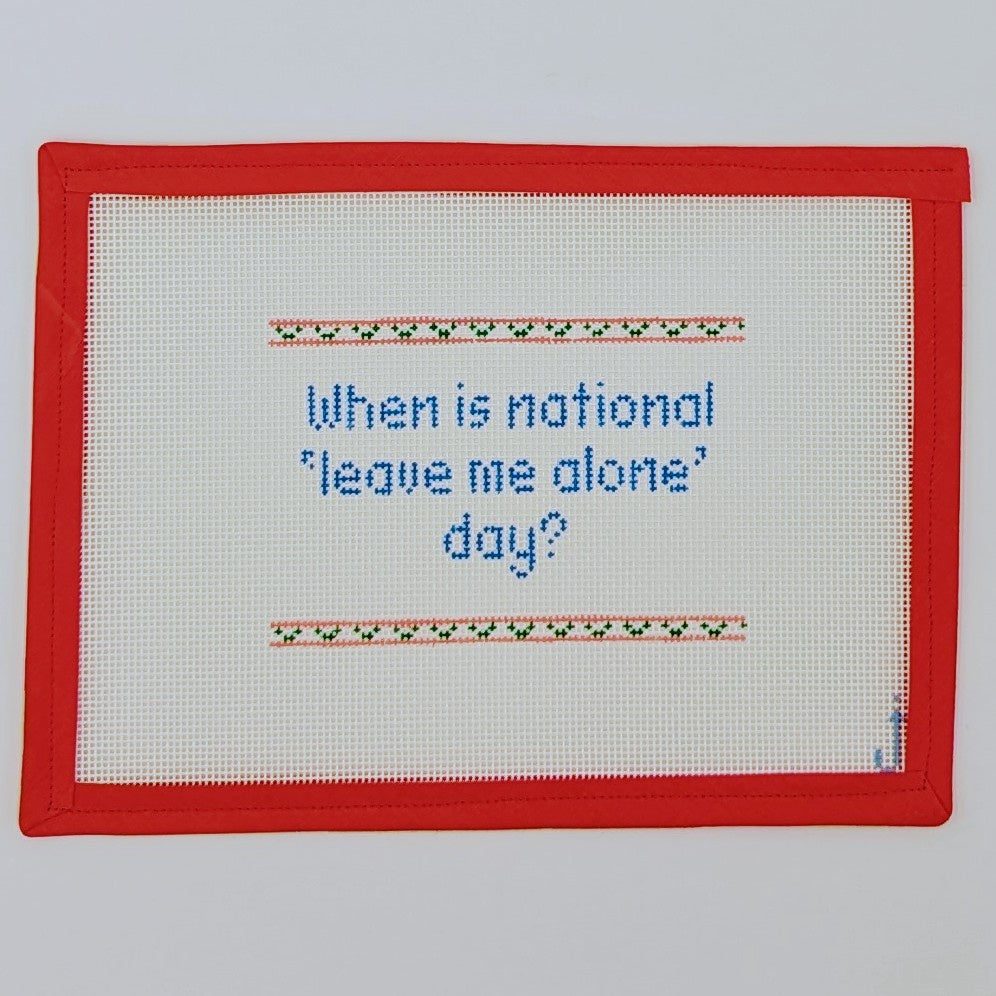 Celebrate the need for some personal space with this Leave Me Alone Day needlepoint canvas! Featuring a fun, no-nonsense design, this canvas is perfect for anyone who appreciates a little time to themselves. Great for creating a unique, humorous piece that shows off your mood in style!