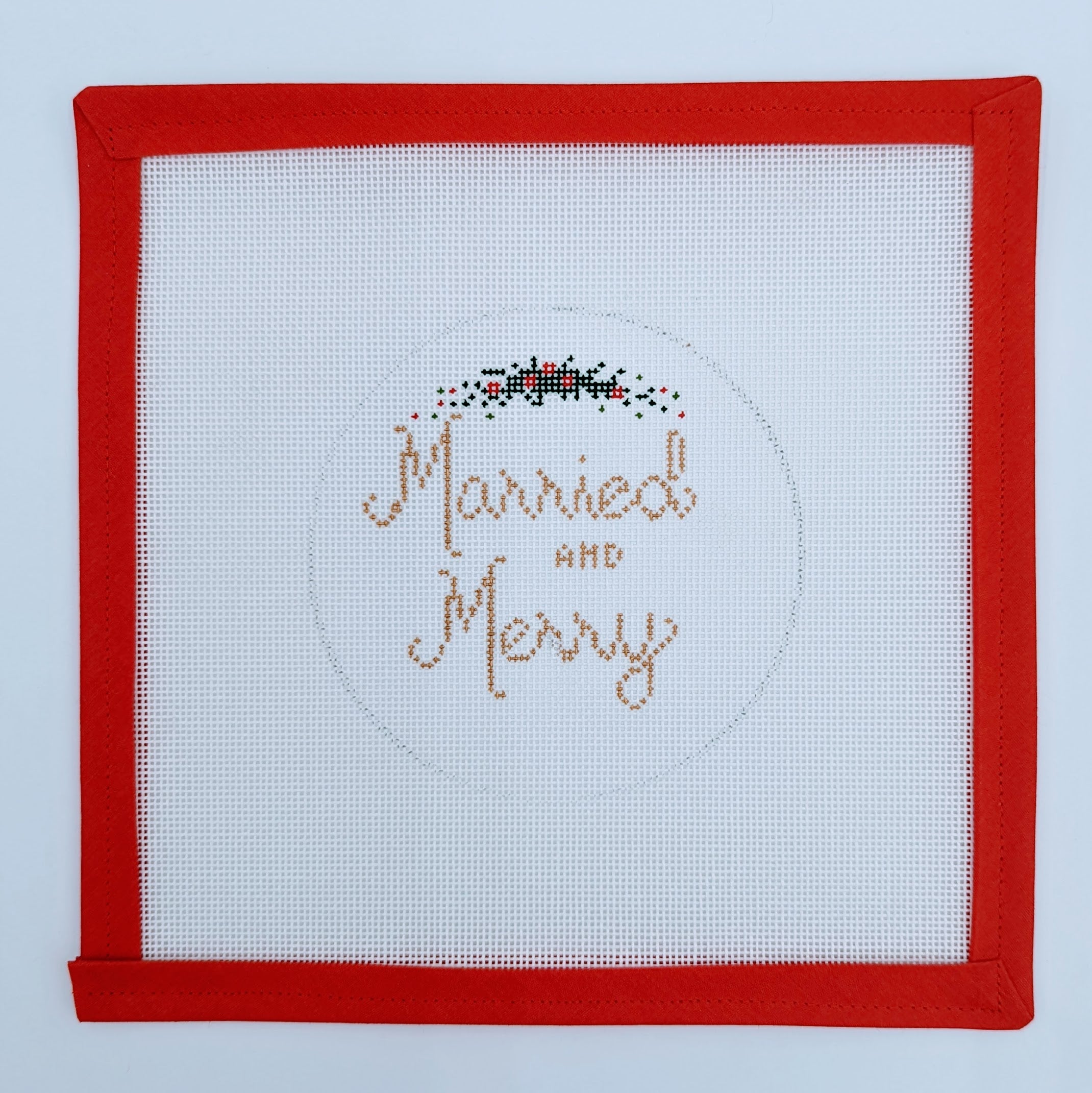 Celebrate love and happiness with the Married and Merry needlepoint canvas! This charming design features a joyful message, making it a perfect addition to your holiday decor or a thoughtful gift for newlyweds. Crafted on an 18 mesh canvas and measuring 4.5" round, this ornament is ideal for showcasing your stitching talents while spreading festive cheer. Stitch this delightful piece and let it add a touch of merriment to your celebrations!