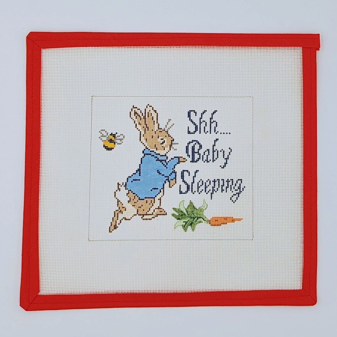 Introduce a touch of whimsy to your nursery with the Peter Rabbit Baby Sleeping Sign needlepoint canvas! This charming design features the beloved character Peter Rabbit in a peaceful sleeping pose, perfect for creating a serene atmosphere in your little one's room. Crafted on an 18 mesh canvas and measuring 5.5" x 6", this piece is ideal for stitching a delightful decorative sign that celebrates the innocence of childhood. Stitch this enchanting canvas to create a treasured keepsake that will be cherished for years to come!