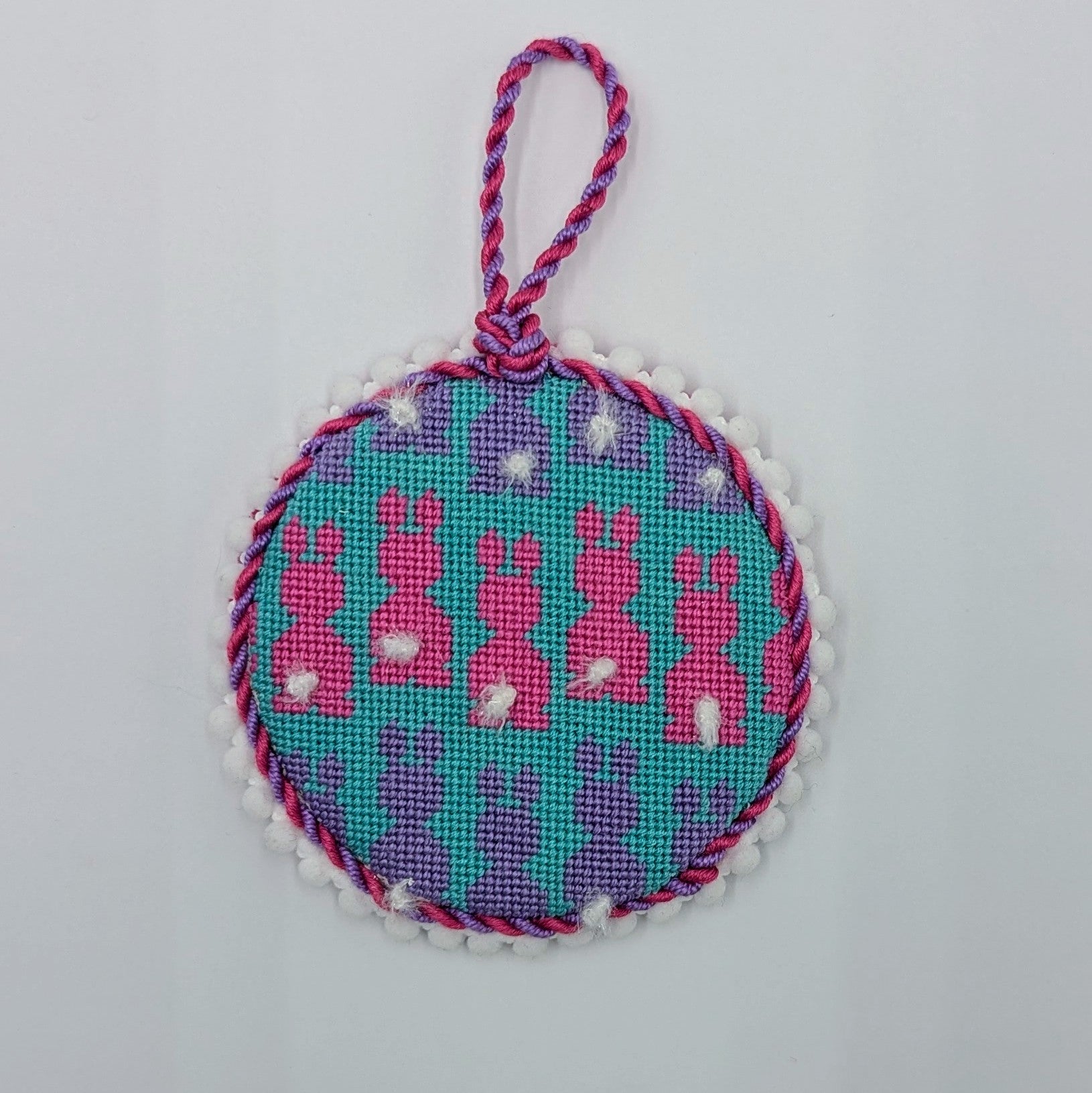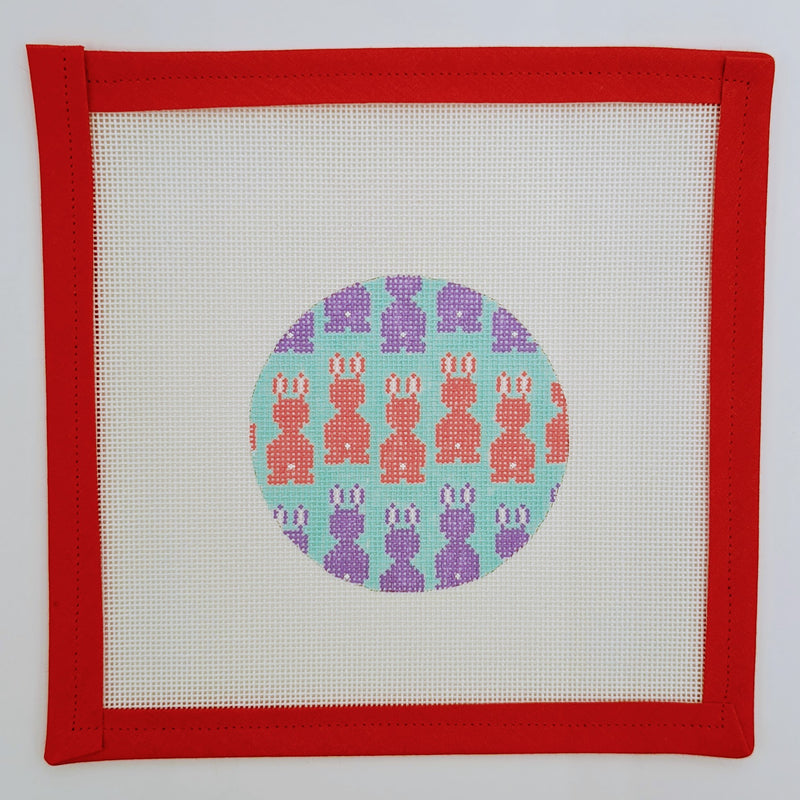 Hop into spring with the delightful Pink & Purple Bunnies on Aqua needlepoint canvas! This charming design features adorable bunnies in playful pink and purple hues against a vibrant aqua background, perfect for adding a cheerful touch to your decor. Crafted on an 18 mesh canvas and measuring 3.5" round, this ornament is ideal for showcasing your stitching creativity. Stitch this whimsical piece for a festive decoration or gift it to a fellow bunny lover!