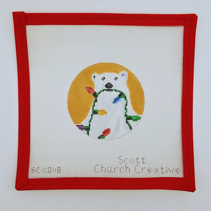 Celebrate the winter season with the adorable Polar Bear with Lights needlepoint canvas! This charming design features a playful polar bear adorned with colorful lights, bringing a festive spirit to your holiday decor. Crafted on an 18 mesh canvas and measuring 4" round, this ornament is perfect for adding a whimsical touch to your tree or home. Stitch this delightful piece and let it light up your celebrations with joy!