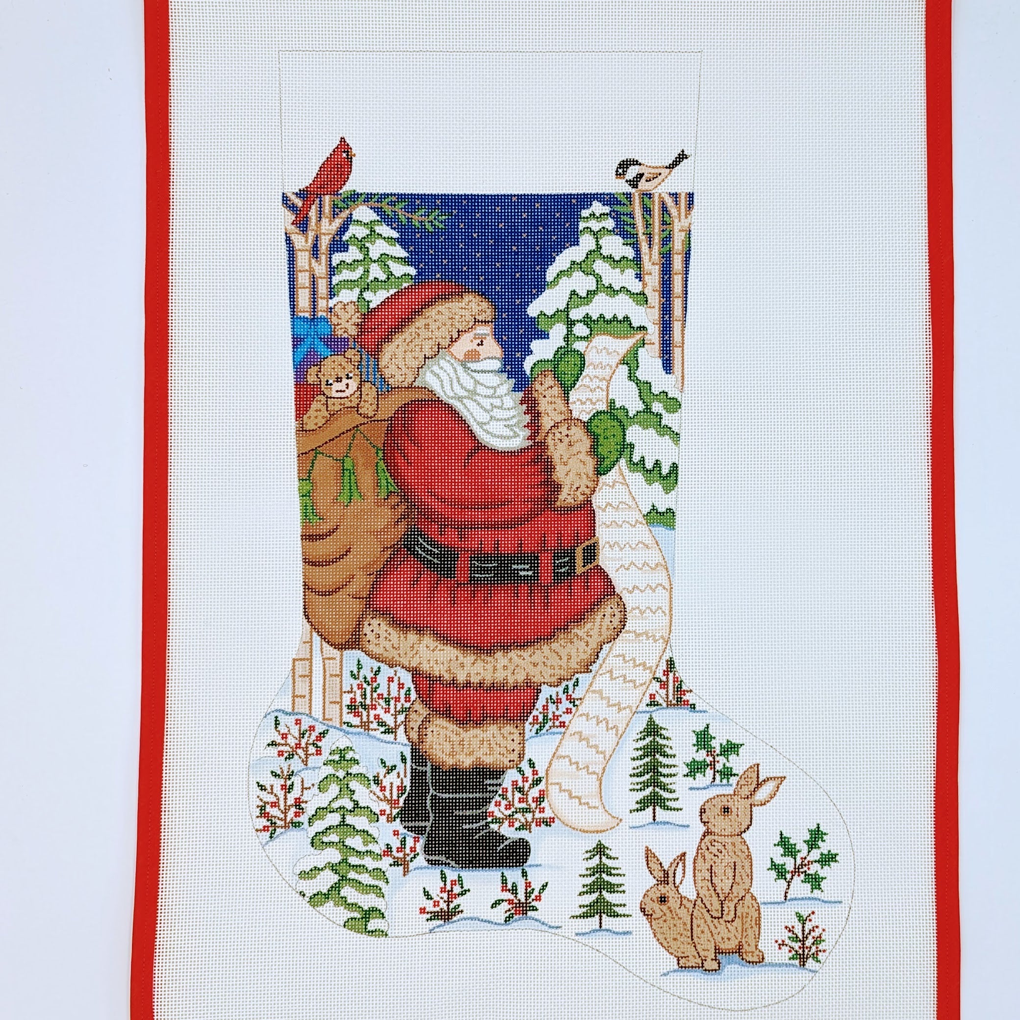 Bring a touch of whimsy to your holiday decor with the Santa w. Cardinal, Bird, & Bunnies Stocking needlepoint canvas! This enchanting design features Santa surrounded by playful bunnies and a vibrant cardinal, capturing the joyful essence of the season. Crafted on a 13 mesh canvas and measuring 22" x 13", this stocking offers plenty of space for stitching intricate details that will delight all who see it. Create a memorable holiday decoration or gift it to a loved one to celebrate the magic of Christmas!