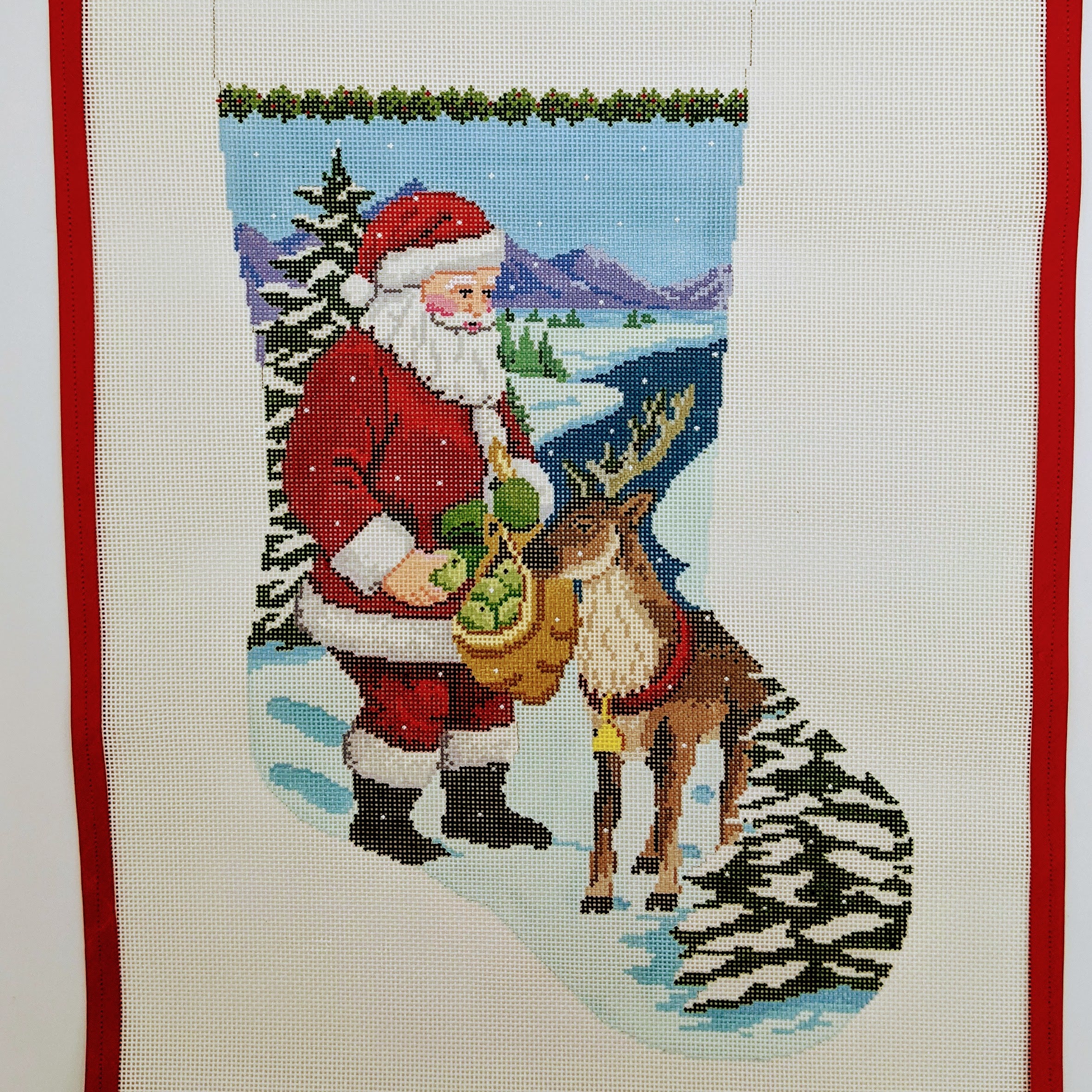 Get ready for the festive season with our charming Santa Feeding Reindeer Stocking needlepoint canvas! This delightful design features Santa in a jolly moment, feeding his trusty reindeer against a backdrop of twinkling snowflakes. Crafted on a sturdy 13-mesh canvas, it's perfect for creating a beautiful and functional stocking that will bring joy to your holidays year after year. Whether you’re stitching it for yourself or gifting it to someone special, this project is sure to spread cheer!
