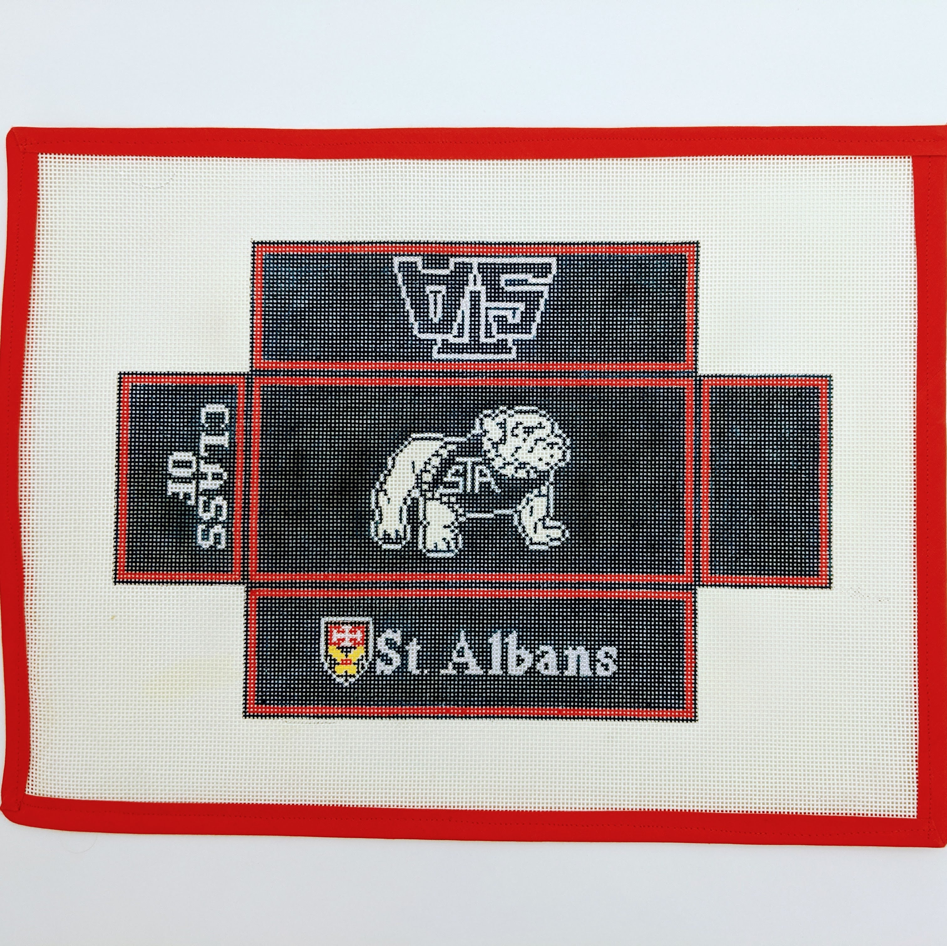 Celebrate your St. Albans pride with this classic St. Albans Brick Cover needlepoint canvas! Designed to fit perfectly over a standard brick, this 13-mesh canvas is a must-have for any St. Albans fan. At approximately 17" x 13.5", it’s a statement piece that adds a touch of tradition and charm to your home decor. Whether you’re stitching it for yourself or as a gift for a fellow alum, this canvas is a timeless way to show off your school spirit. Perfect for fireplaces, shelves, or as a decorative accent!