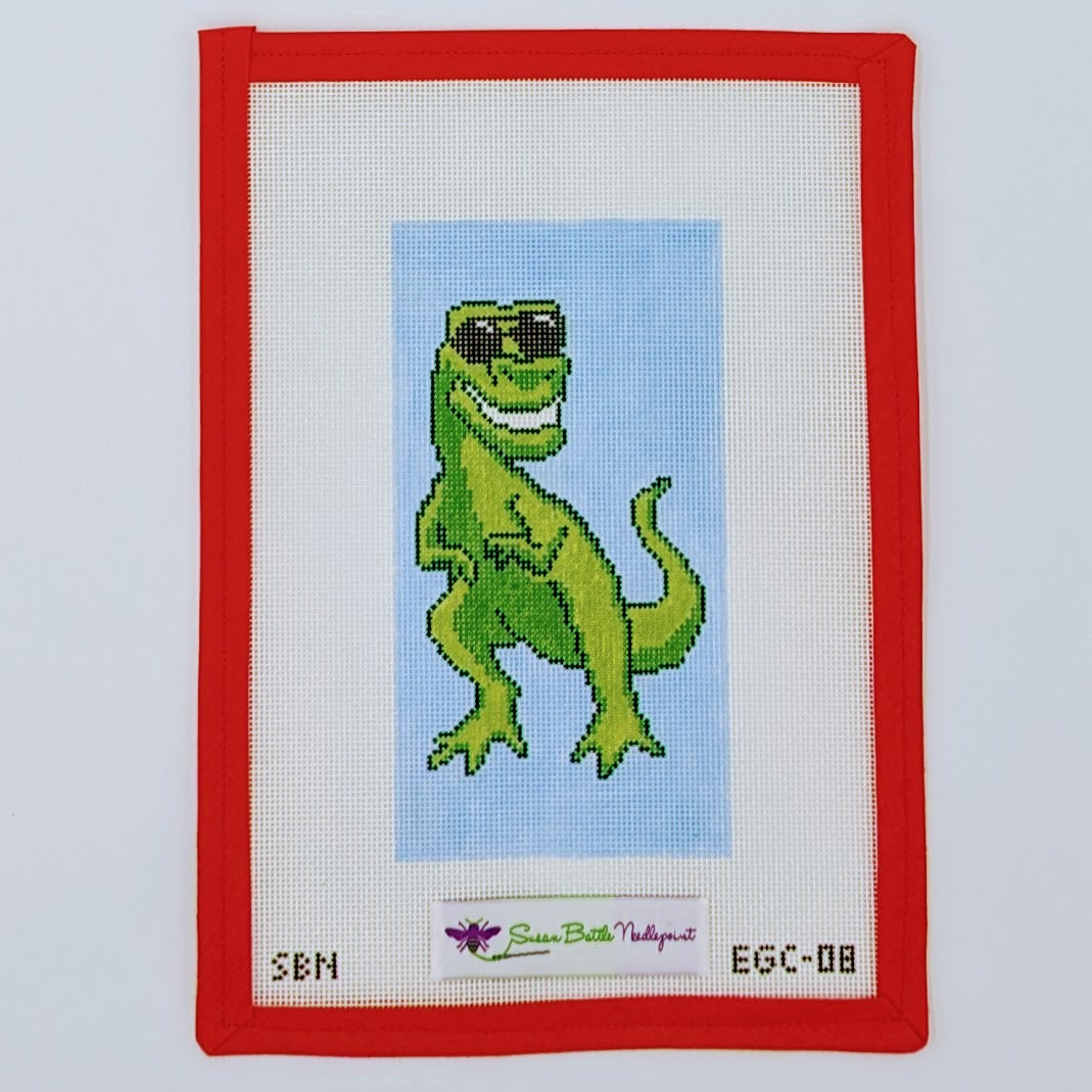 Unleash your creativity with this fun and quirky T-Rex with Glasses Eyeglass Case needlepoint canvas! Featuring a stylish T-Rex sporting a pair of glasses, this playful design is perfect for adding personality to your eyeglass or sunglass case. Great for dinosaur lovers or anyone who wants a unique, functional accessory to stitch and showcase.