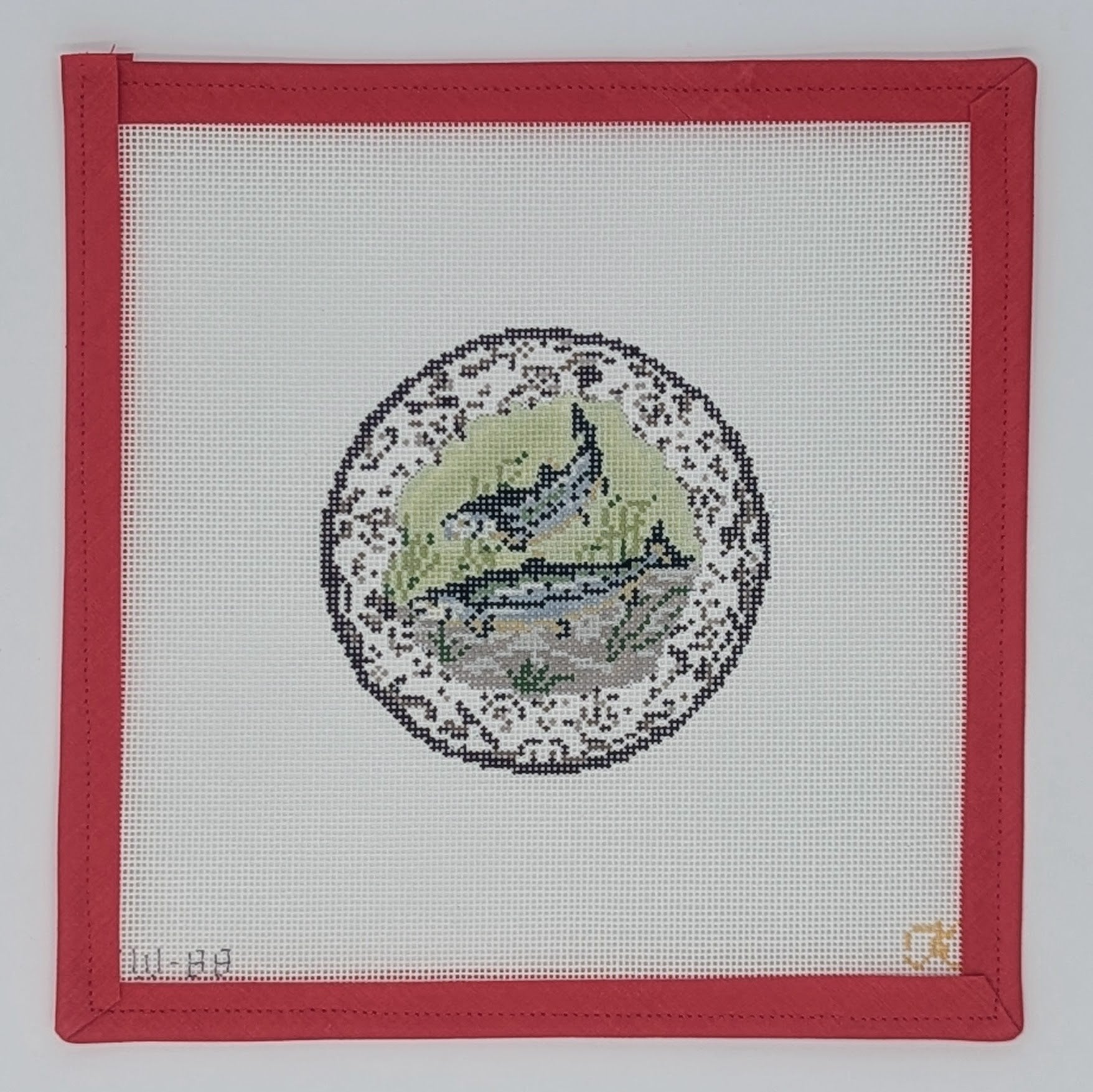 Enhance your decor with the Transferware Salmon needlepoint canvas! This exquisite design features a beautifully detailed salmon in the iconic transferware style, perfect for adding a touch of elegance and charm to your home. Crafted on an 18 mesh canvas and measuring 4" round, this piece is ideal for stitching a unique ornament that showcases your appreciation for both art and nature. Stitch this captivating canvas and let it bring a classic touch to your decor!