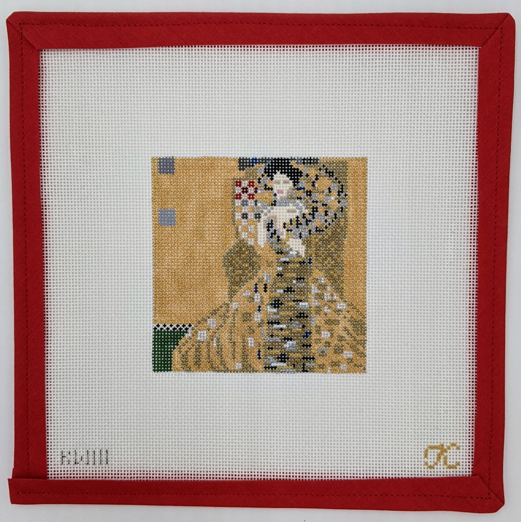 Add a touch of elegance to your decor with the Woman in Gold needlepoint canvas! This stunning design features a beautiful representation inspired by classic art, perfect for art enthusiasts and fans of sophisticated decor. Crafted on an 18 mesh canvas and measuring 3.75", this piece is ideal for stitching a unique ornament or decorative item that showcases your appreciation for art. Stitch this captivating canvas and let it bring a sense of beauty and sophistication to your home!